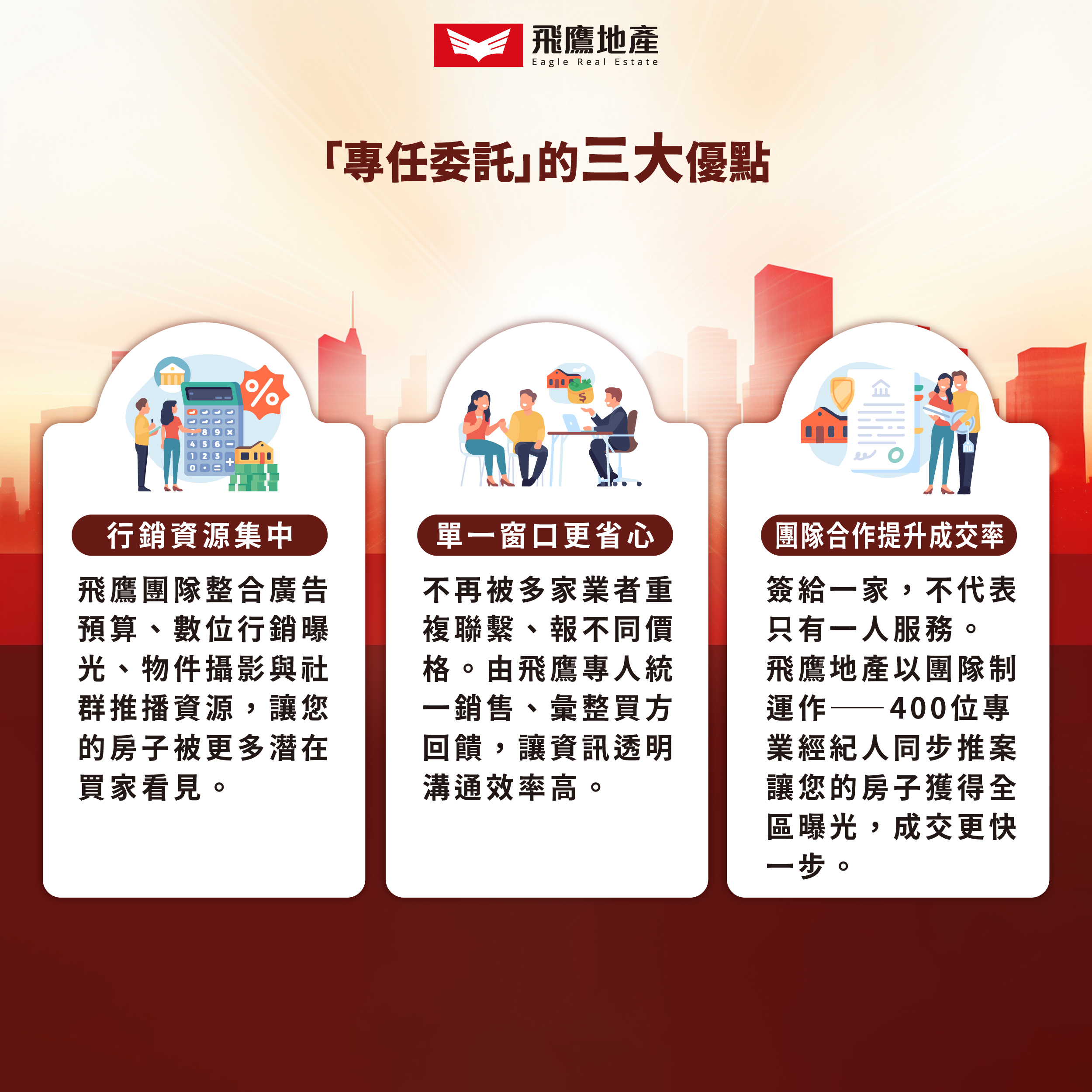 #飛鷹地產,協助每位屋主做出正確委託選擇,了解專任機制的保障與效益,讓賣屋變輕鬆,成交更順利!