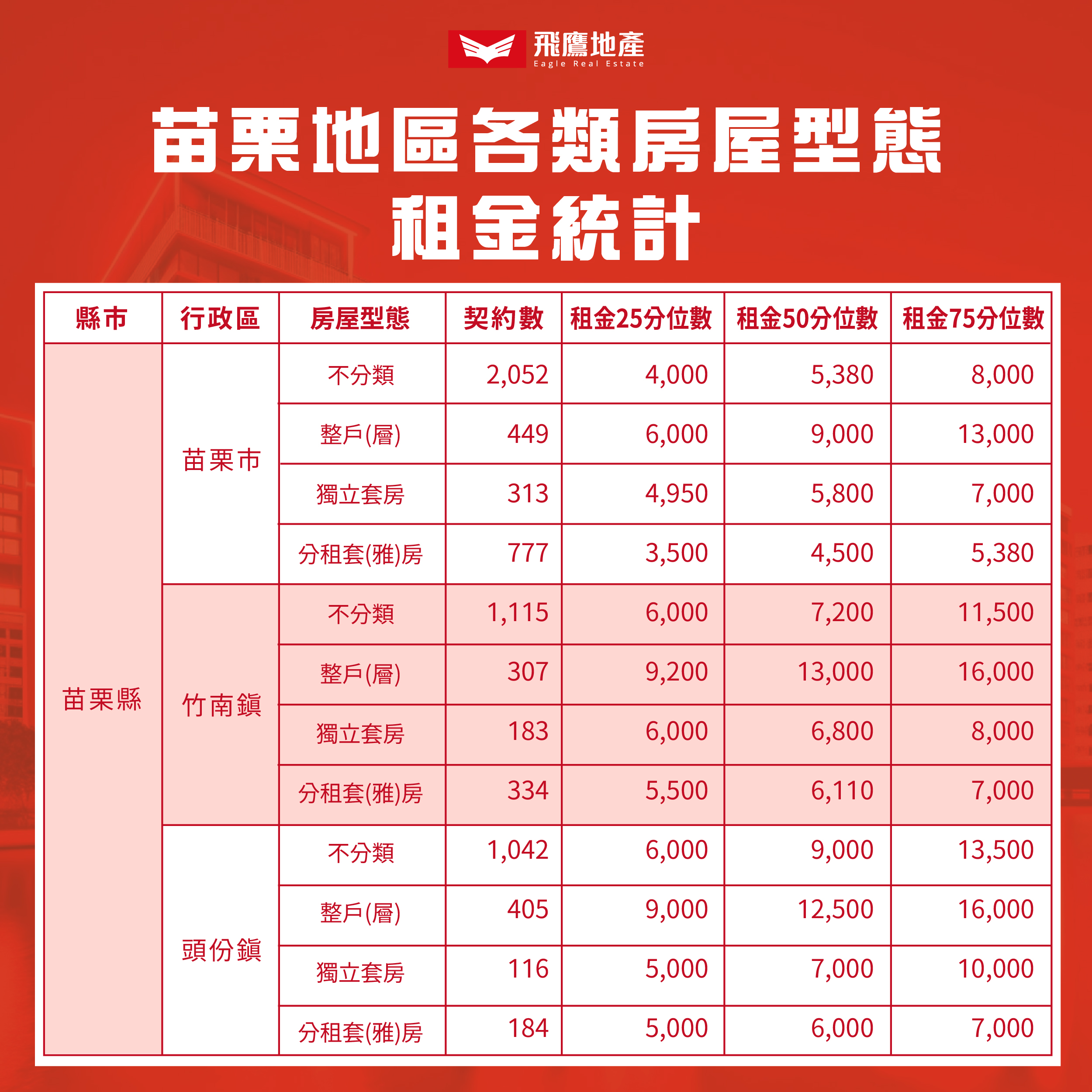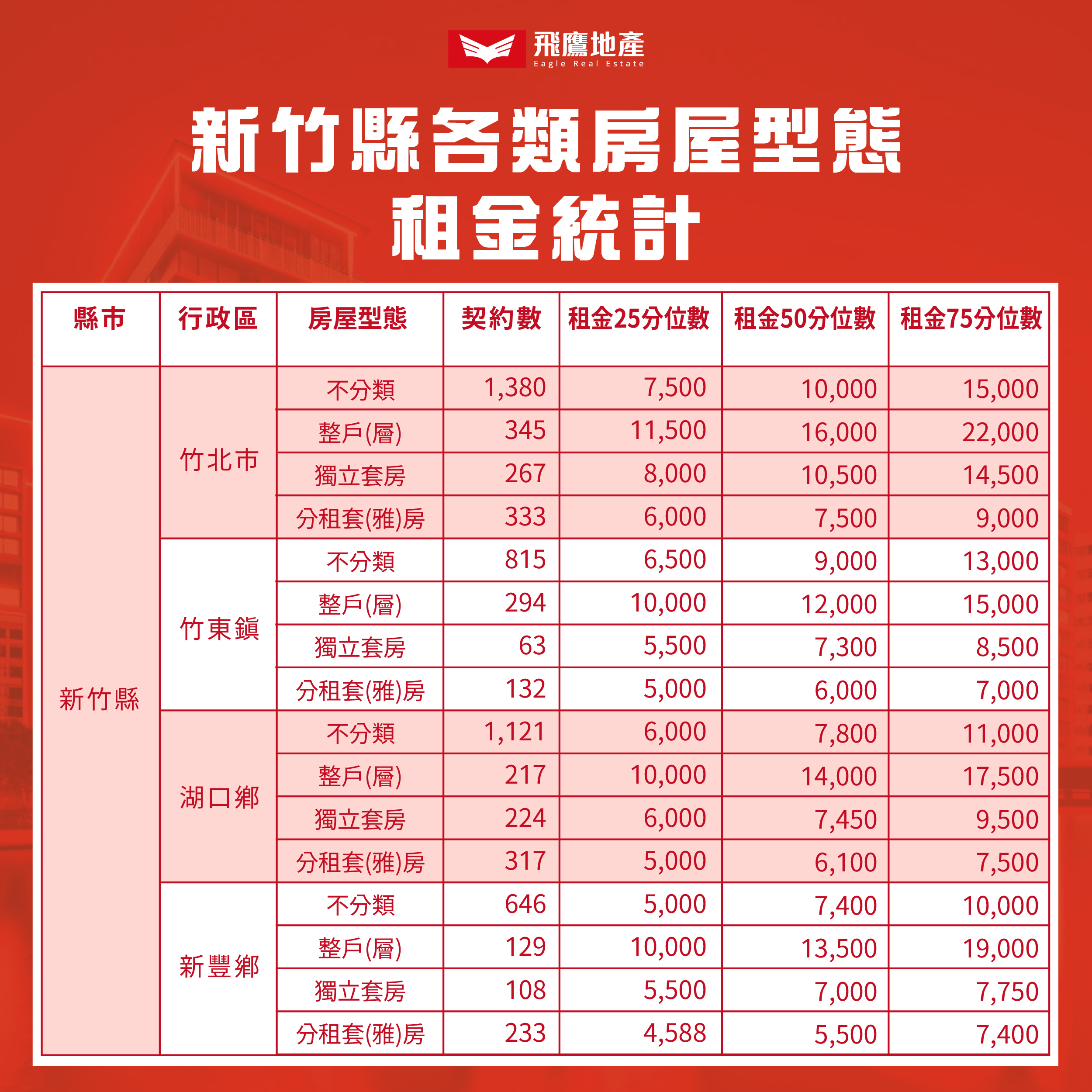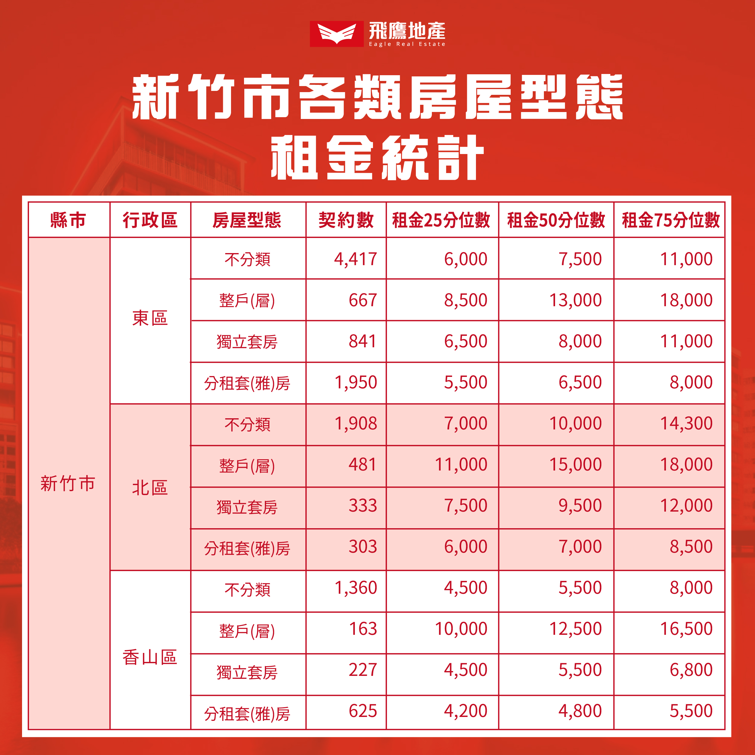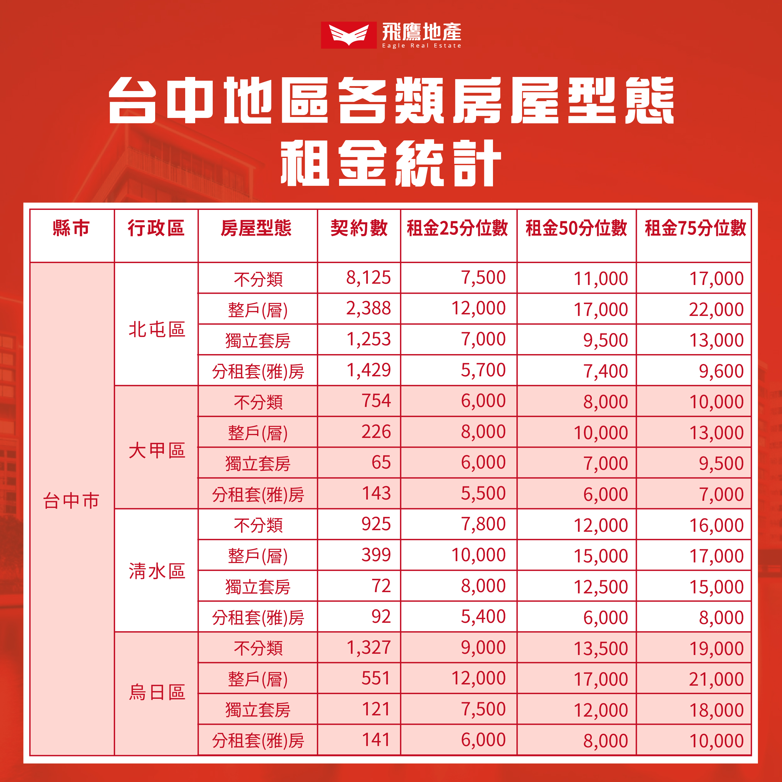 飛鷹地產觀察統計資料中,整理出桃園、新竹、苗栗、台中的不分類房屋型態租金75分位數統計,桃園租金最高行政區是八德區、桃園區、蘆竹區並列1.6萬,新竹租金最高行政區是竹北區1.5萬元,苗栗租金最高行政區是頭份1.35萬,台中租金最高行政區是烏日1.9萬,提供桃園、新竹、苗栗、台中地區的房東及民眾租金價格的依據。