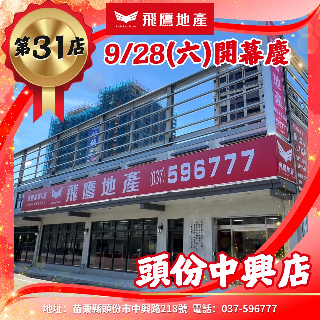 親愛的朋友們~✨飛鷹地產第31間店 頭份中興店 即將盛大開幕啦!🎊不管您是我們的老朋友,還是第一次來拜訪,我們都迫不及待想和大家見面!😎等著您來一起交流聊聊!💬📅 日期:9月28日 (六)🕰 時間:上午10點🏠 地址:苗栗縣頭份市中興路218號快把這個日子記到 #行事曆 上,一起迎接這令人期待的開幕日吧!🎉🎈感謝您一直以來的 #支持與愛護 ❤️9月28日,我們在頭份中興店,不見不散!👋💫