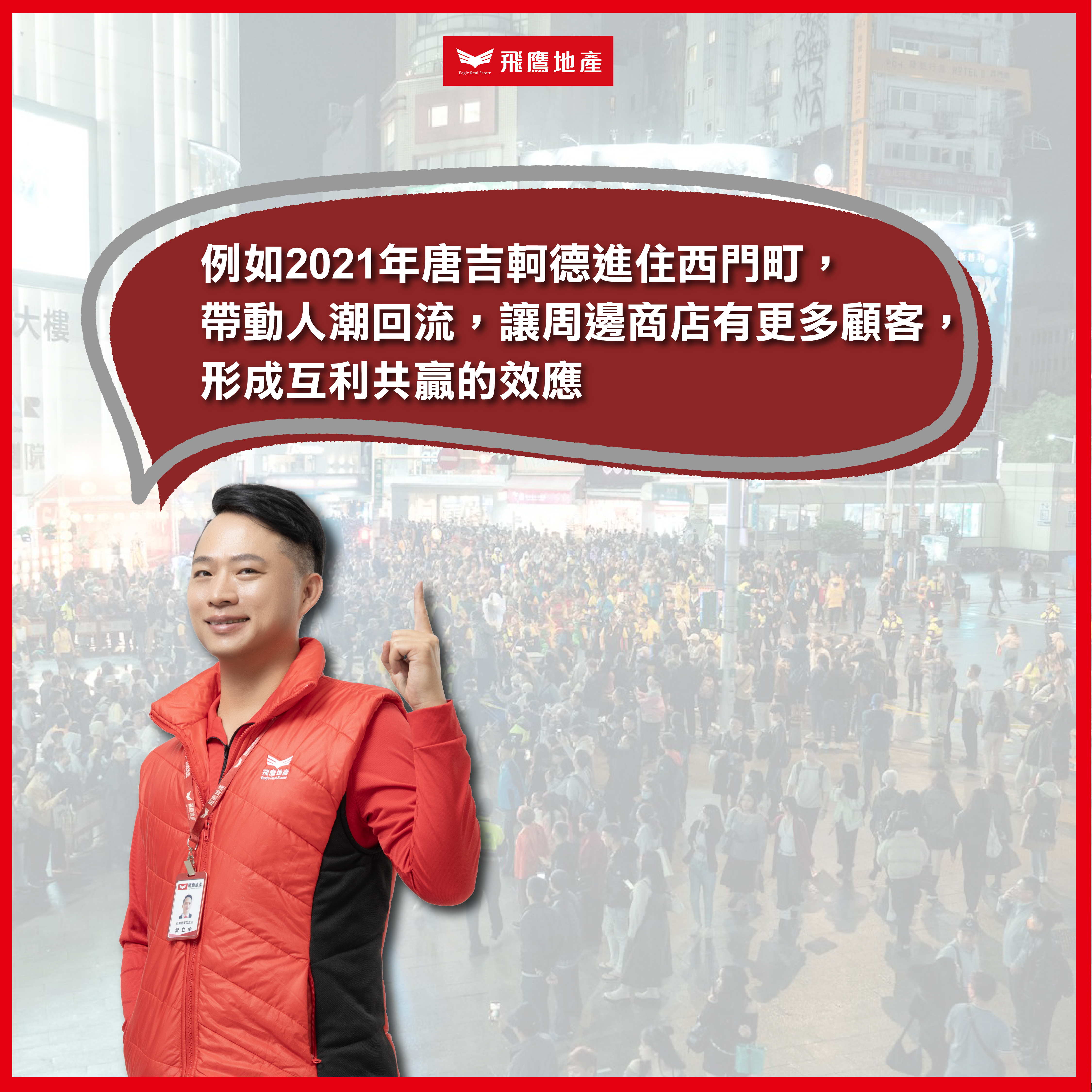 以日本零售品牌唐吉訶德為例,2021年進駐西門町不僅帶動人潮湧入,還為周邊商店帶來更多顧客,形成互利共贏、免費曝光的效應。