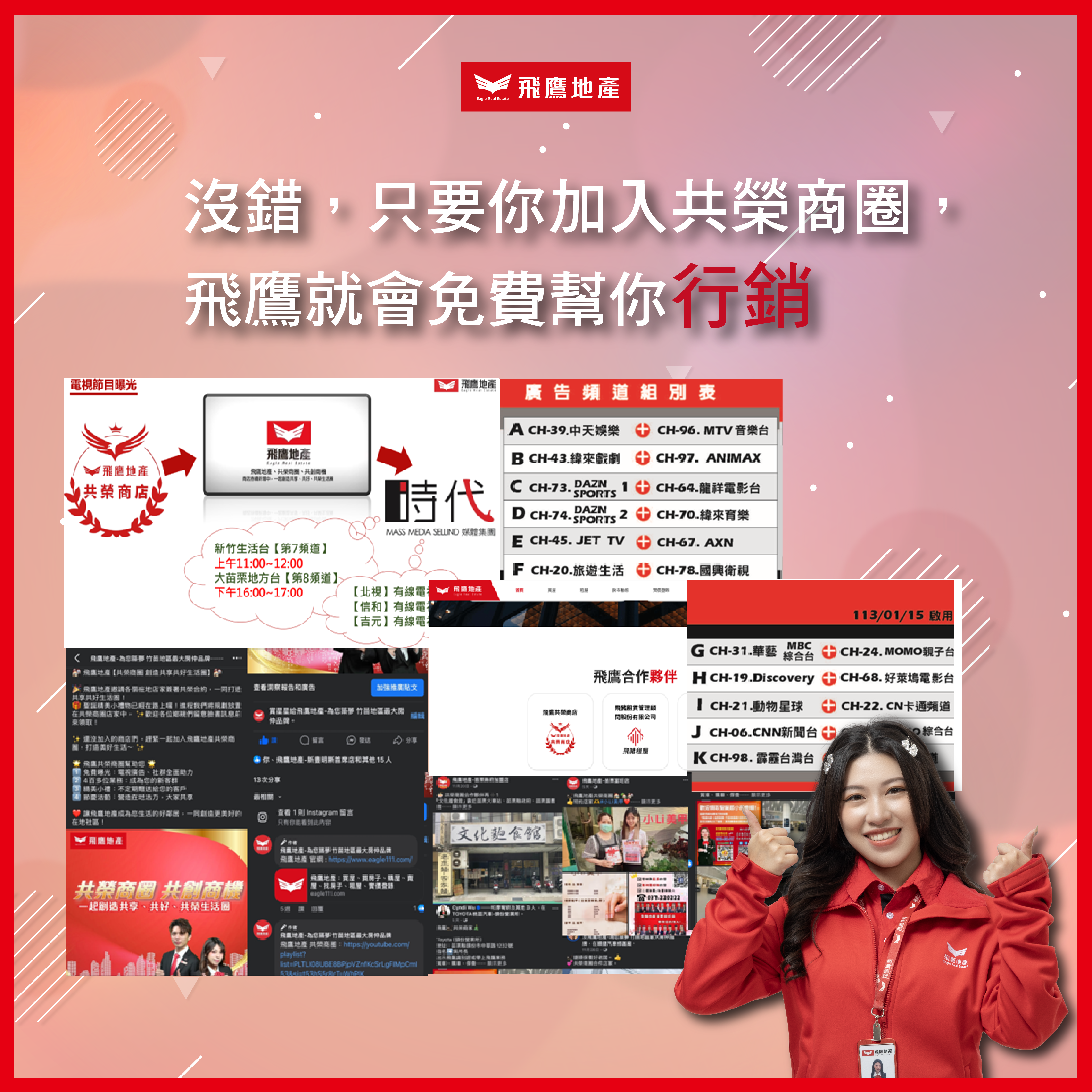 飛鷹作為竹苗地區最大的房仲品牌,將為加入共榮商圈的店家提供多元宣傳,包括社群貼文、YouTube 影片製作、電視節目廣告投放等,全面提升品牌曝光度。只有你想不到,沒有飛鷹做不到!
